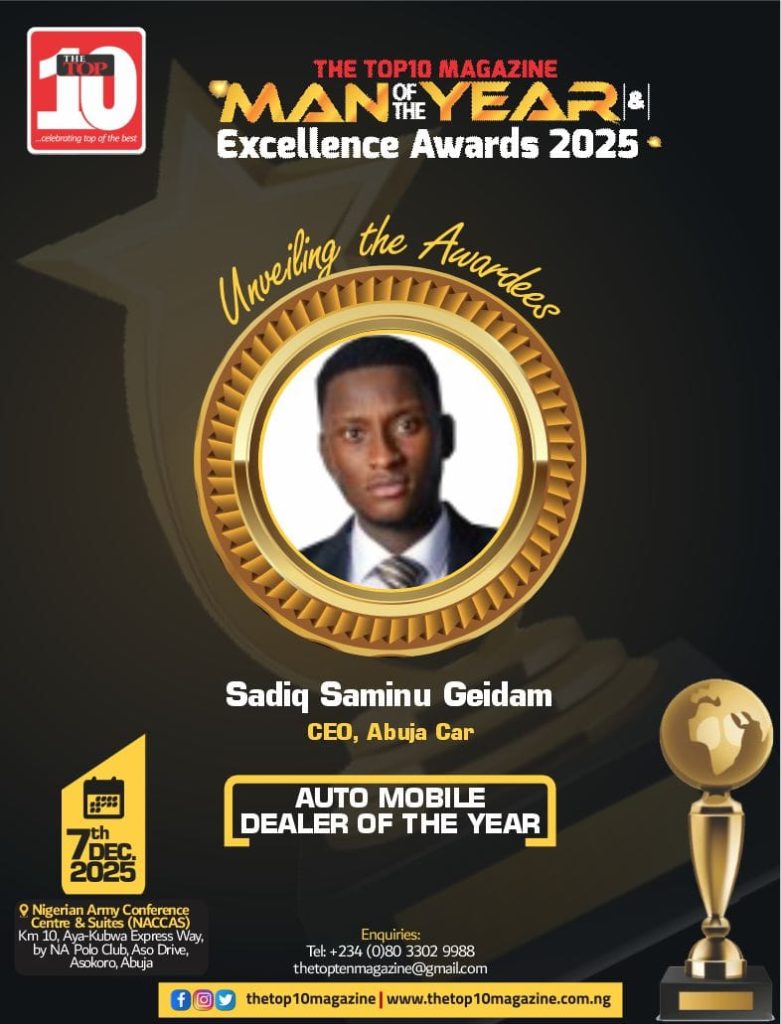 The selection of Sadiq Saminu Geidam as The Top10 Magazine’s Automobile Dealer of the Year is in recognition of his pragmatic leadership in piloting the affairs of Abuja Car to record milestone achievements as a major game changer in the Nigerian automobile industry, which is highly reputed for its business integrity.