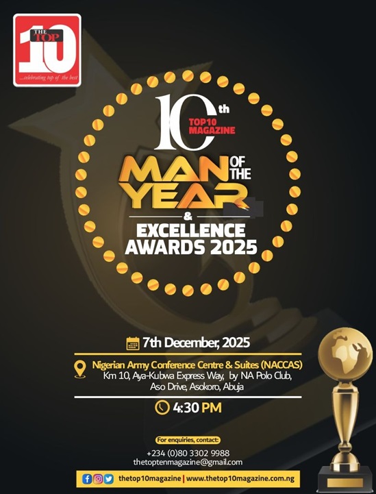 December 7th is the D-day and Abuja is the destination for the 10th edition of The Top10 magazine Man of the Year and Excellence Awards 2025. The Nigerian Army Conference Centre & Suites, NACCAS, one of the current best Conference and meeting destinations in Abuja is the venue.
